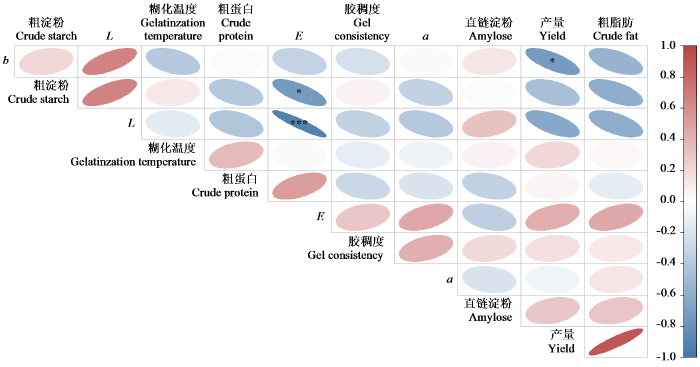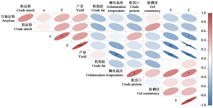 将供试小米磨粉后,分别于色差仪上测定米色,每个材料3次重复,记录其测量值明亮度(L)、红绿色度(a)和黄蓝色度(b),按公式计算色差值(E):E=(∆L2+∆a2+∆b2)1/2。