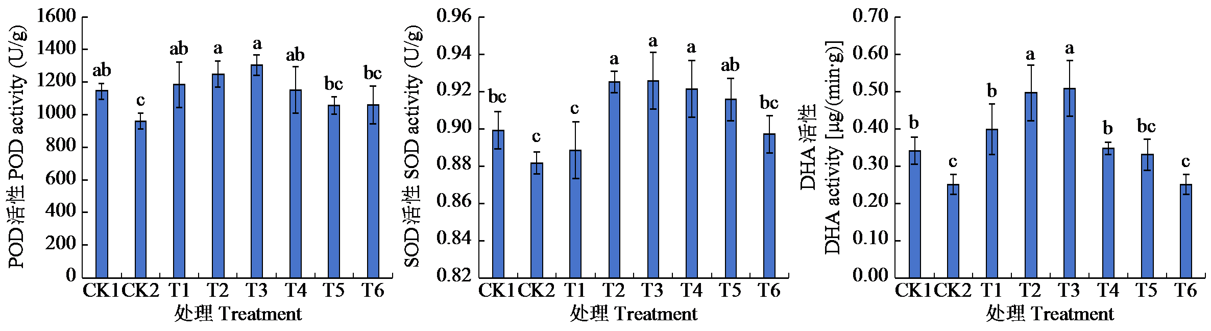 | Fig.1 Effects of ZNC on antioxidant enzyme activities of oat seedling leaves under saline-alkali stress Different lowercase letters indicate significant differences at the P < 0.05 level. The same below. |