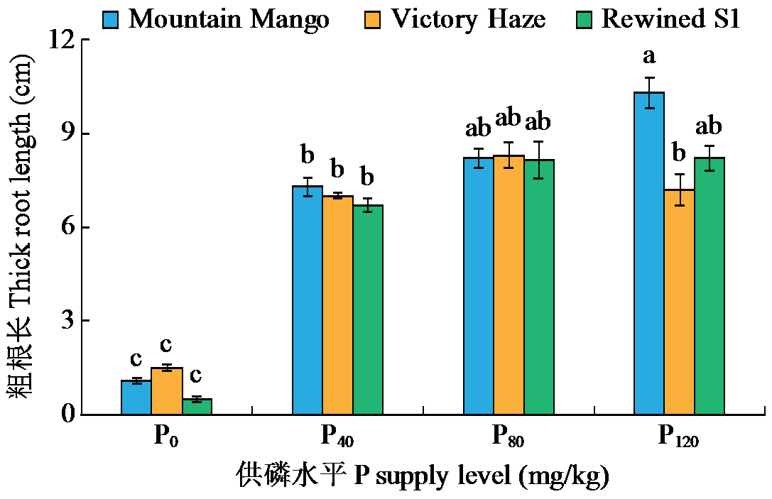 | Fig.2 Effects of the interaction between varieties and P supply levels on coarse root length |