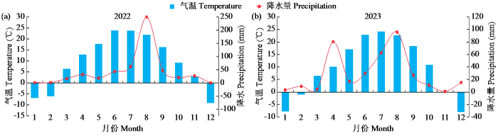 试验于2022-2023年在山西省河曲县曲峪旱作农业示范基地开展(111°26′52″ E,39°15′28″ N),属于典型的温带半干旱季风气候,平均海拔1367 m,年均气温7.1 ℃、年蒸发量1121 mm、年降水量447.5 mm(图1)。春季干旱较严重。土壤类型为壤土,耕层0~20 cm,pH 8.3,全氮含量1.61 g/kg,有机质6.40 g/kg,全磷644.04 g/kg,速效磷63.56 g/kg。小粒黑豆全生育期所需水分均靠自然降水。
