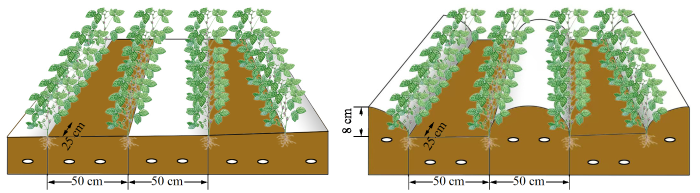 以当地推广的连枷条黑豆品种为试验材料,该品种生育期约140 d。试验设置6个处理,分别为无膜+不施肥(CK)、无膜+复合肥(NPK)、平作覆膜+复合肥(C+NPK)、平作覆膜+有机肥无机配施(C+NPKM)、垄作覆膜+复合肥(R+NPK)和垄作覆膜+有机无机肥配施(R+NPK),垄作覆膜的垄高为8 cm(图2)。每个处理4个重复,随机区组排列,小区面积60 m2(5 m×12 m),共28个小区,种植密度为4500株/667 m2,2022年和2023年小粒黑豆分别于5月10日和5月13日播种,收获期分别为10月15日和10月17日。复合肥(N、P2O5、K2O为28:12:10)作为底肥,施肥量为600 kg/hm2。有机肥为羊粪,施用量为7500 kg/hm2。肥料均在播种前一次性施入。小粒黑豆全生育期所需水分均靠自然降水,且生长期内不使用农药和除草剂,其他田间管理按当地农户常规管理。