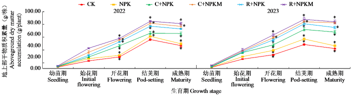 不同处理对小粒黑豆不同生育时期地上部干物质积累量的影响如图3所示,2022年和2023年小粒黑豆地上部干物质积累量均表现为随着生育期的延长呈先升高后降低的趋势。2022年和2023年在小粒黑豆成熟期,R+NPKM处理的小粒黑豆地上部干物质积累量较CK分别增加了96.61%和134.02%,较C+NPKM处理分别增加了6.23%和8.70%。与CK相比,覆膜显著提高了小粒黑豆在开花结荚期和成熟期的干物质积累量,且R+NPKM处理的干物质积累量在开花结荚期和成熟期达到最大。与C+NPKM相比,2023年R+NPKM处理的干物质积累量在开花期和结荚期分别提高了8.70%和5.20%,成熟期提高了2.03%;与NPK相比,C+NPKM处理2年的干物质积累量在结荚期分别显著提高69.43%、84.17%,R+NPKM处理分别提高了58.72%和66.99%。R+NPKM处理的小粒黑豆地上部干物质积累量在2年不同生育期均达到最大。