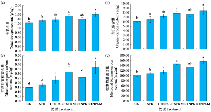 如图4所示,与CK相比,覆膜提高了土壤的全氮、有机碳、可溶性有机碳和微生物量碳含量,各处理的有机碳及其组分的含量均表现为R+ NPKM>C+NPKM>R+NPK>C+NPK>NPK>CK,与CK相比,R+NPKM处理显著提高了小粒黑豆土壤全氮、有机碳、可溶性有机碳和微生物量碳含量。与C+NPKM相比,R+NPKM处理的土壤全氮、有机碳、可溶性有机碳和微生物量碳含量分别提高4.56%、7.10%、15.63%和6.29%,但差异不显著。与NPK相比,C+NPKM和R+NPKM处理的土壤各指标均不同程度增加。其中R+NPKM各土壤指标均最高,与CK和NPK处理相比差异显著,土壤有机碳含量分别提高38.30%和2.61%,可溶性有机碳含量分别提高146.67%和105.55%,微生物量碳含量分别提高59.10%和28.26%,但与C+NPKM处理相比差异不显著。