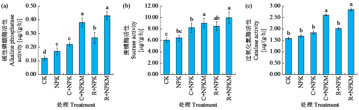 不同处理对小粒黑豆结荚期土壤酶活性的影响如图5所示,与CK相比,覆膜处理显著提高了小粒黑豆的土壤酶活性,其中R+NPKM处理的土壤酶活性最高,与C+NPKM处理相比,R+NPKM处理的碱性磷酸酶、蔗糖酶和过氧化氢酶活性分别提高13.16%、10.77%和9.20%。与NPK处理相比,C+NPKM和R+NPKM处理的土壤酶活性均有所提高。各处理的土壤酶活性均表现为R+NPKM>C+ NPKM>R+NPK>C+NPK>NPK>CK。与CK和NPK处理相比,R+NPKM处理碱性磷酸酶活性分别提高258.33%和152.94%,蔗糖酶活性分别提高64.96%和55.21%,过氧化氢酶活性分别提高79.25%和68.64%,但与C+NPKM处理相比差异不显著。