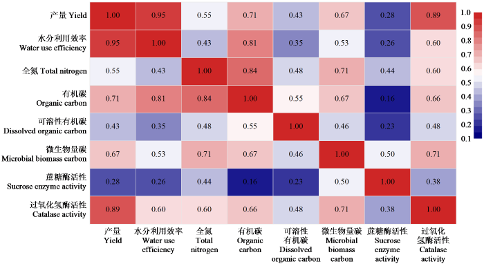 由图6可知,土壤含水量、土壤酶活性和土壤有机碳含量等均影响小粒黑豆的产量,水分利用效率与小粒黑豆产量的相关系数较大,小粒黑豆产量与土壤全氮、有机碳含量、微生物量碳及过氧化氢酶活性均呈显著正相关关系。
