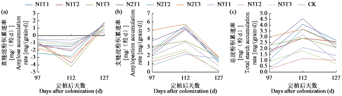 不同氮肥处理下荸荠直链淀粉、支链淀粉和总淀粉积累速率