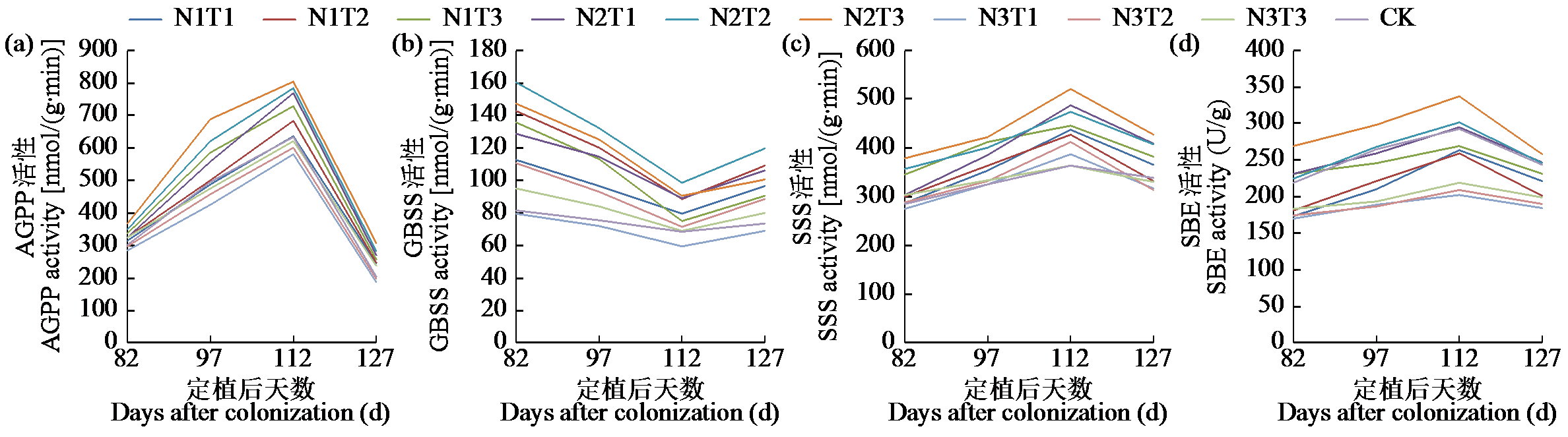 | Fig.2 AGPP, GBSS, SSS and SBE activities in water chestnut under different nitrogen fertilizer treatments |