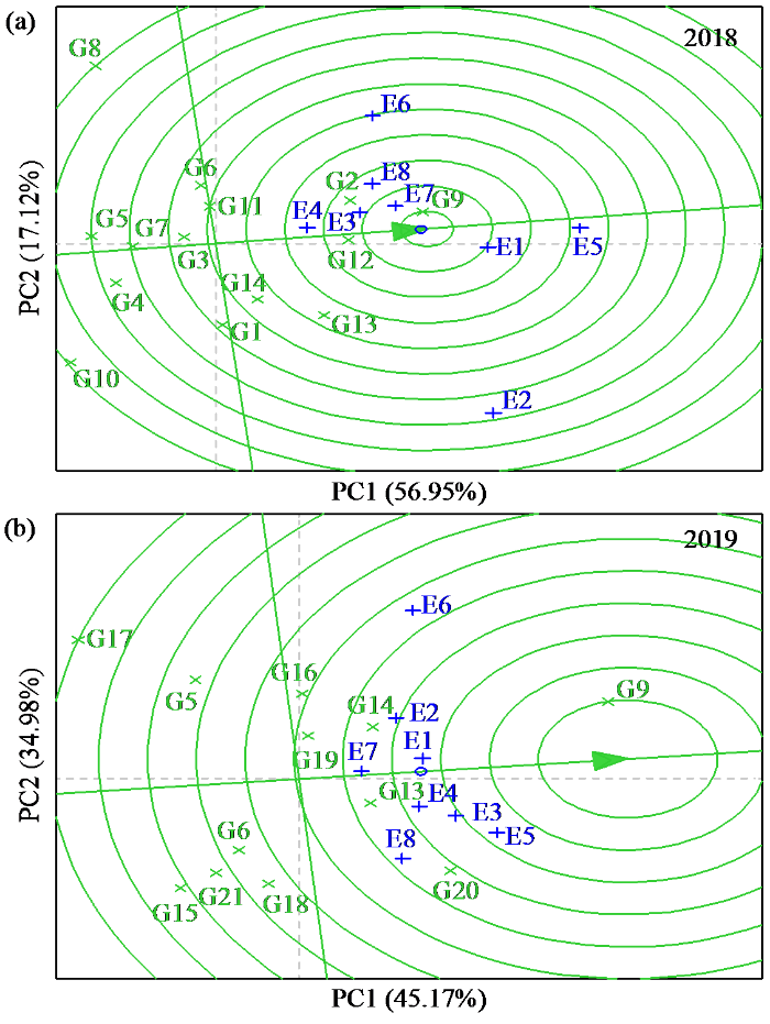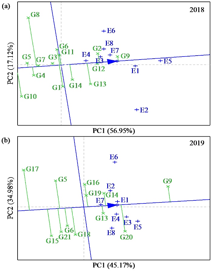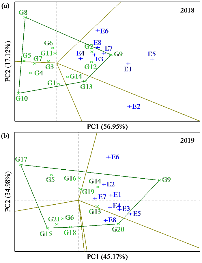 图3b中被分为4个扇区,其中E1、E2、E3、E4、E5、E6和E7等7个试点在一个扇区内,E8在另一个扇区内,8个试点被分为2个类型;各个方向上距离最远的点用直线连接为一个四边形,位于4个顶点的品种分别为G9、G17、G15、G20;G9在E1、E2、E3、E4、E5、E6和E7等7个试点中产量最高,表明其适宜在类似区域种植;G19最靠近原点,说明G19对环境变化不敏感。