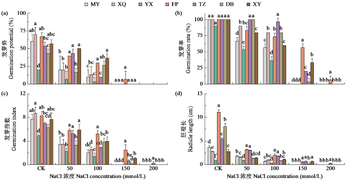 进一步测定发现,随着NaCl处理浓度的增加,发芽指标均呈下降趋势(图2)。在CK处理下,FP的胚根长势最好。在50 mmol/L NaCl处理下,FP、TZ和XY受抑制影响较小,YX的发芽势和发芽指数最低,发芽速度最慢;与CK相比,FP和DB胚根长下降幅度较大,分别下降了71.4%和83.3%。在100 mmol/L NaCl处理下,冬瓜品种间发芽率的差异性较大,MY、YX和FP下降幅度出现明显的差异;与CK相比,MY、FP和DB的胚根长下降幅度较大,分别下降了80.4%、81.9%和89.4%。在150 mmol/L NaCl处理下,MY、XQ和YX种子无法萌发;在200 mmol/L NaCl处理下,只有FP表现出了较强的耐盐潜力。