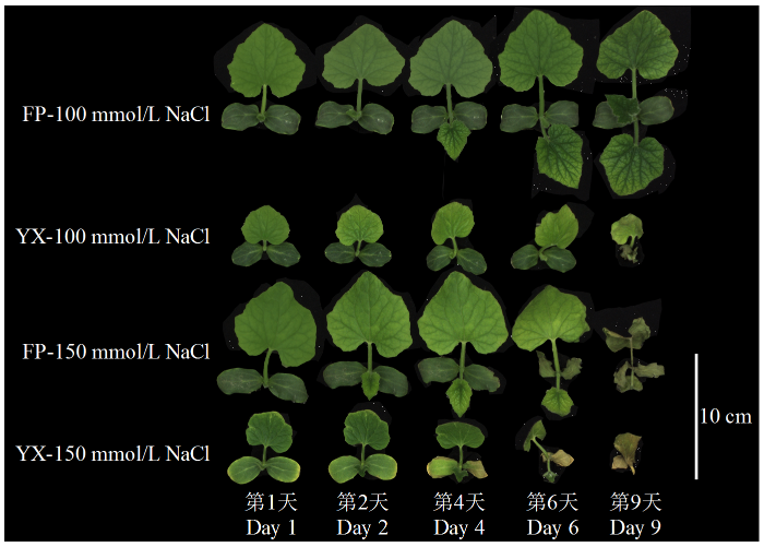 为进一步筛选适宜的盐浓度处理,选择前期差异较大的2个冬瓜品种FP和YX进行动态观测(图4)。结果发现,在100 mmol/L NaCl浓度处理下,YX叶片在第2天开始黄化,第9天开始褐化萎蔫,而FP叶片在第6天开始黄化,未出现褐化萎蔫现象;在150 mmol/L NaCl浓度处理下,YX在第1天开始黄化,第4天开始褐化萎蔫,FP在第2天开始黄化,第6天子叶开始萎蔫。综上,100 mmol/L NaCl处理可以作为冬瓜品种间耐盐性鉴定的适宜浓度。
