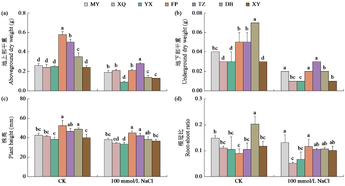 在CK处理下,FP、TZ和DB的干物质积累显著高于其他品种(图5)。盐胁迫抑制了株高、根冠比和生物量的积累,此时XQ和YX生长受抑制较为严重。与CK相比,100 mmol/L NaCl处理下XQ、YX、FP和DB株高下降的幅度较大,分别下降了17.1%、13.2%、14.3%和21.4%。100 mmol/L NaCl处理下YX、FP、TZ、DB和XY整株生物量均受到严重抑制,MY和XQ地下部抑制程度更为明显,MY、XQ、YX、FP、TZ、DB和XY地上部干物质积累较CK处理分别降低了25.8%、14.9%、62.4%、62.8%、44.5%、59.6%和46.5%,根系干物质积累分别降低了36.2%、60.4%、76.7%、51.6%、43.7%、78.5%和53.5%。与CK相比,盐胁迫下MY和DB根冠比下降幅度较大,分别为53.5%和42.7%。