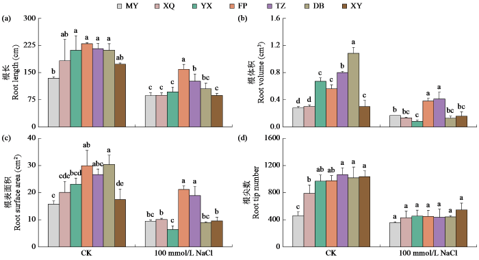 盐胁迫显著抑制冬瓜根系生长(图6)。在CK处理下,各品种的根系指标均有差异。100 mmol/L NaCl处理下MY、XQ、YX、FP、TZ、DB和XY根长较CK处理分别降低了35.6%、52.3%、54.3%、30.6%、41.7%、50.2%和49.8%,MY在CK下根长显著低于YX,但是在盐胁迫下两者没有显著性差异。在CK处理下,FP、TZ和DB的根表面积显著高于其他品种,盐胁迫下FP和TZ的根表面积和根体积均显著高于其他品种。盐胁迫下MY、XQ、YX、FP、TZ、DB和XY根尖数较CK处理分别降低了21.9%、45.6%、52.8%、54.0%、58.8%、52.6%和47.1%。