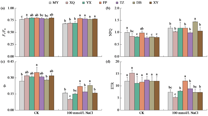 盐胁迫下PSII受损,PSII反应中心潜在最大量子产量Fv/Fm受到抑制(图7)。在盐胁迫处理下,只有MY、XQ和YX受到光化学伤害,分别下降了11.6%、13.4%和13.7%。盐胁迫处理下MY、XQ、YX、FP、TZ、DB和XY较CK处理NPQ分别提高了15.4%、17.8%、31.2%、16.4%、20.6%、44.2%和24.4%。qP反映了PSⅡ光合电子传递活性的高低,盐胁迫下XQ和YX的qP下降幅度最多,分别下降了67.3%和52.8%。与CK相比,盐胁迫下叶片ETR下降,其中XQ和YX下降幅度最大,分别下降了65.4%和42.2%。