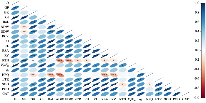 D:D值,GP:发芽势,GR:发芽率,GI:发芽指数,RaL:胚根长,ADW:地上部干重,UDW:地下部干重,RCR:根冠比,PH:株高,RL:根长,RSA:根表面积,RV:根体积,RTN:根尖数。“*”表示相关性显著(P < 0.05),“**”表示相关性极显著(P < 0.01),“***”表示相关性极显著(P < 0.001)。