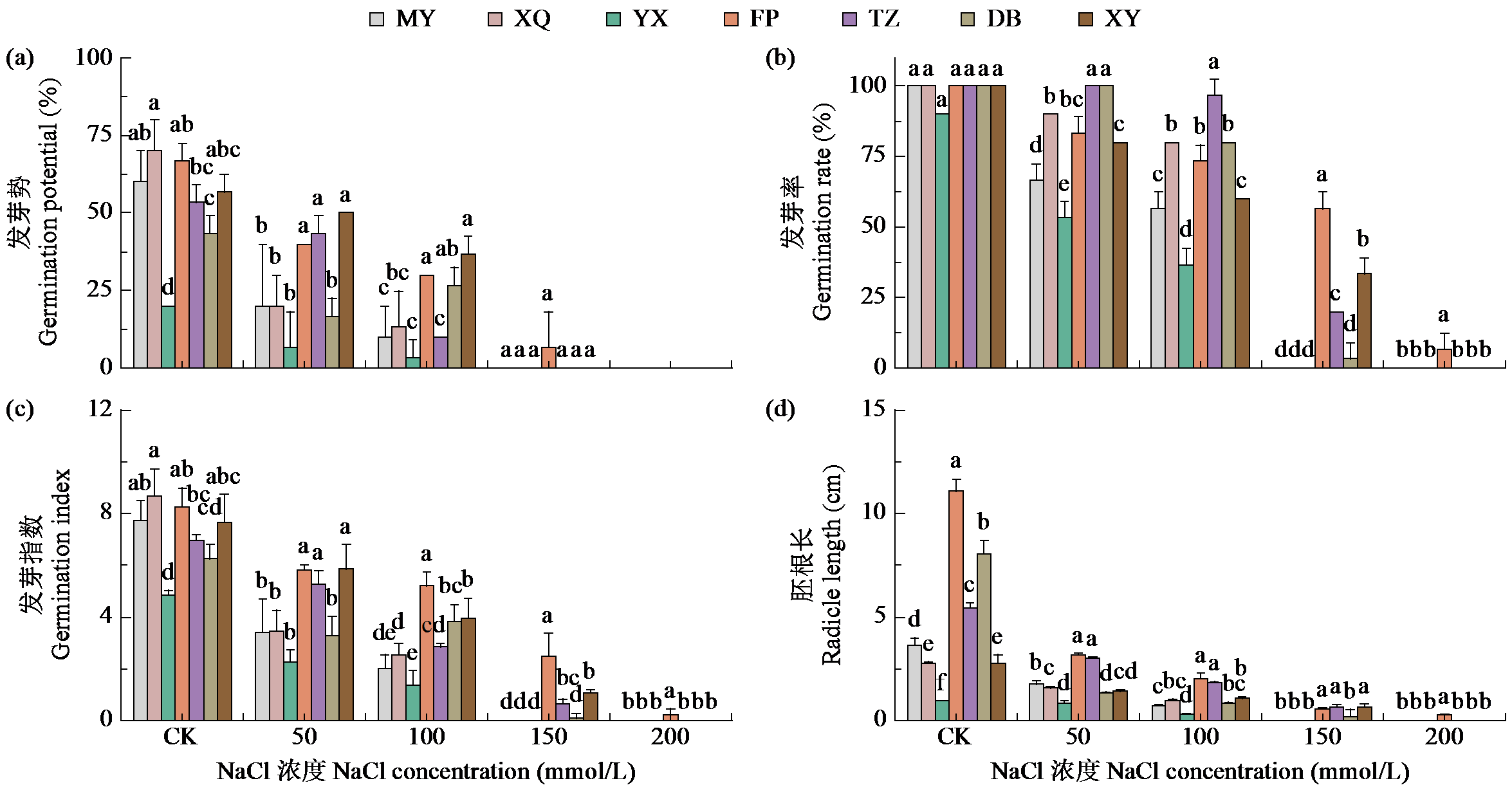 | 图2 冬瓜品种间种子萌发对不同NaCl浓度的差异响应 不同小写字母表示在P < 0.05水平差异显著,下同。 |