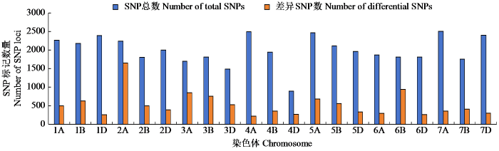 通过筛选,共获得41 912个有效SNP标记,各染色体标记分布并不均衡,由图1可知,7A染色体上标记最多(2506),4D上标记最少(897)。SNP标记在A、B和D基因组上分布相对均匀,A基因组最多(15 542),B基因组次之(13 422),D基因组最少(12 948)。