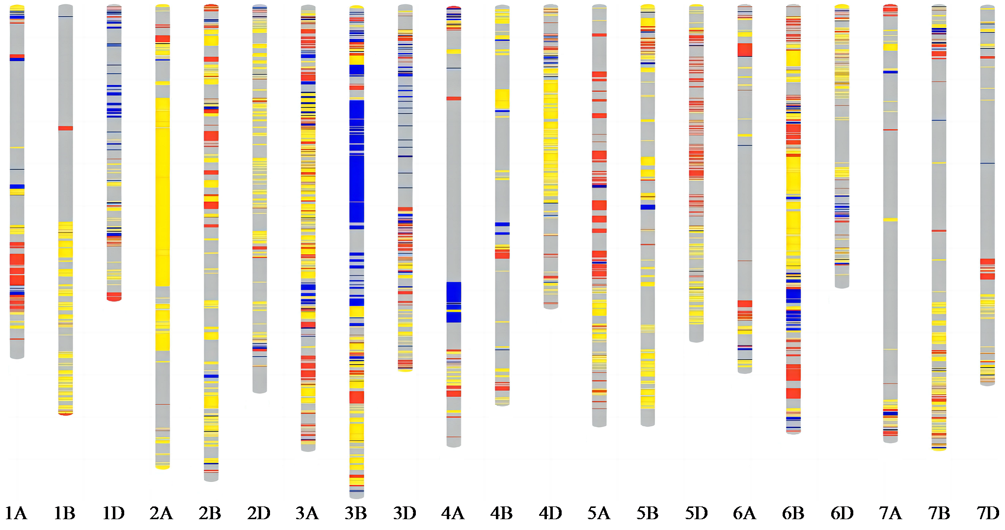 | 图3 周麦27号及其亲本的基因组构成图谱 红色:源于矮抗58的区段;黄色:源于周麦16的区段;蓝色:周麦27号特异性区段;灰色:矮抗58和周麦16共同检测到的区段。 |