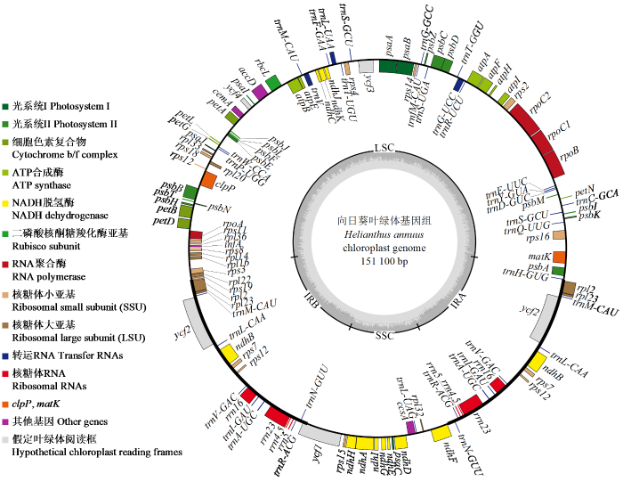 叶绿体是植物特有的细胞器,在植物细胞中扮演能量转换的角色,并参与多个重要的生命活动[1]。叶绿体基因组结构简单,长度一般在107~218 kb,包含大量的遗传信息,叶绿体具有独立于细胞核的基因组,与核基因组相比,叶绿体基因组具有拷贝数高、进化速率适中且全基因组序列更容易获取等特点。随着测序技术的发展,叶绿体基因组研究迅速,叶绿体全基因组学成为物种鉴定分类和基因组进化分析的重要工具。目前,在NCBI数据库上收集的向日葵属叶绿体完整基因组仅有60个,亟需补充更多的向日葵属叶绿体基因组数据,从而理清菊科植物系统发育进化过程,为菊科植物向日葵品种的定位、分类、开发与改良奠定基础。