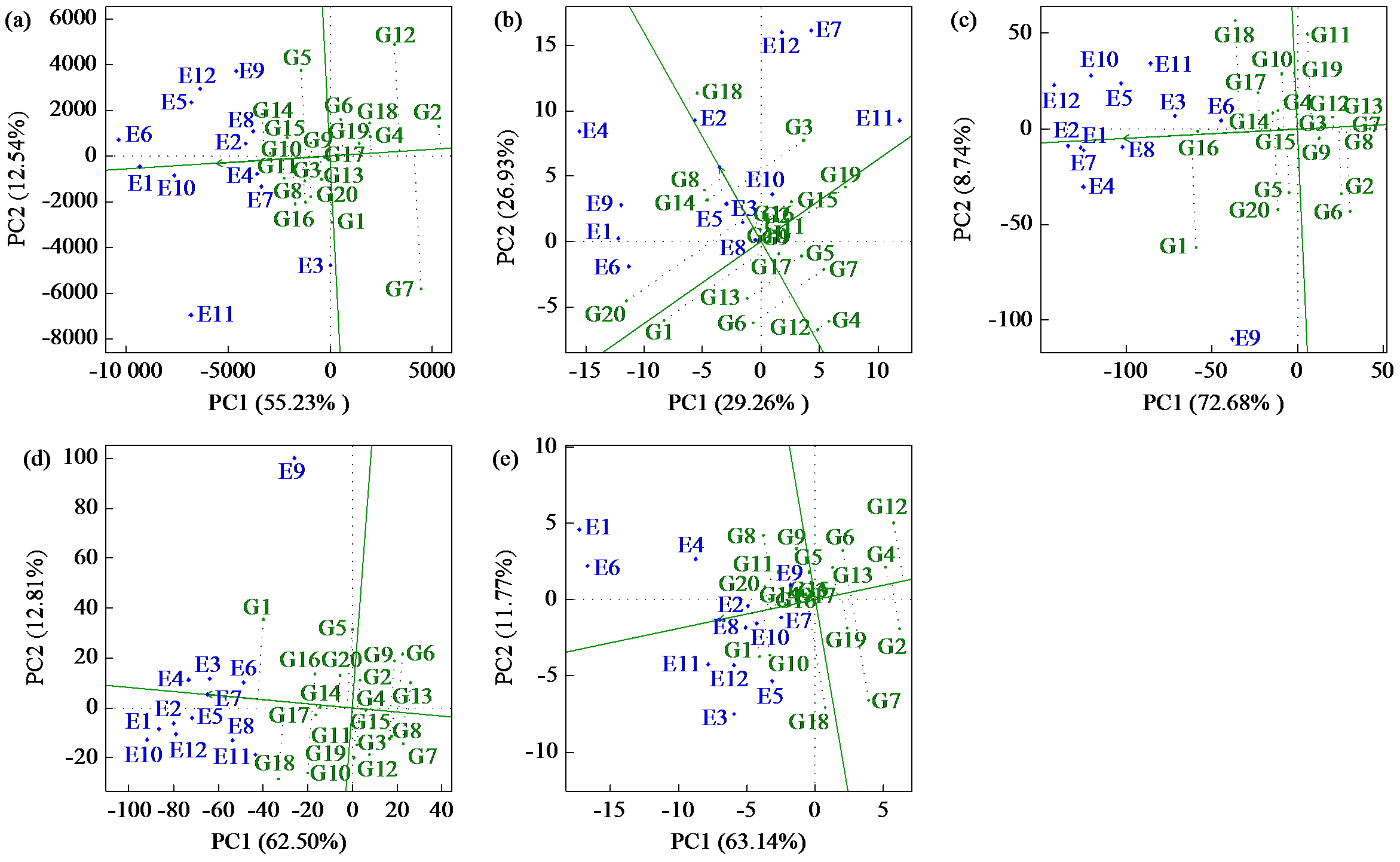 | Fig.2 “Mean vs. Stability” biplots for agronomic traits of silage corn varieties (a) dry weight; (b) moisture content of whole plant; (c) plant height; (d) ear height; (e) the number of green leaves. |