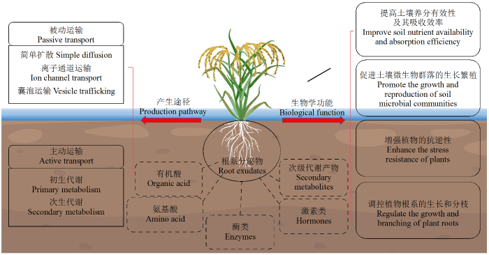 根系分泌物的产生途径可分为代谢途径与非代谢途径[18],代谢途径进一步细分为初生代谢和次生代谢,前者为植物提供必需的物质、能量与信息,后者不直接参与植物生长发育,而是帮助植物应对环境胁迫;非代谢途径则主要来源于植物根系残体或脱落物,这些分解产物会作为根系分泌物进入土壤,影响土壤环境和微生物群落[19]。水稻根系分泌物的释放方式主要分为主动运输和被动运输2类。主动运输假说认为,分泌物的释放是借助膜蛋白逆电化学梯度选择性释放的耗能过程;被动运输假说则认为,分泌物的释放是沿电化学梯度进行的扩散过程,包括简单扩散、离子通道运输和囊泡运输等[20]。其中,离子通道分为慢阴离子通道和快阴离子通道,前者激活需几秒,后者仅需几毫秒。此外,随着水稻根际微生物活性增强、数量增多,其代谢分泌的产物能有效分解土壤有机物,提高土壤有效性,促进水稻生长发育,进而反过来刺激根系分泌物的产生[21]。