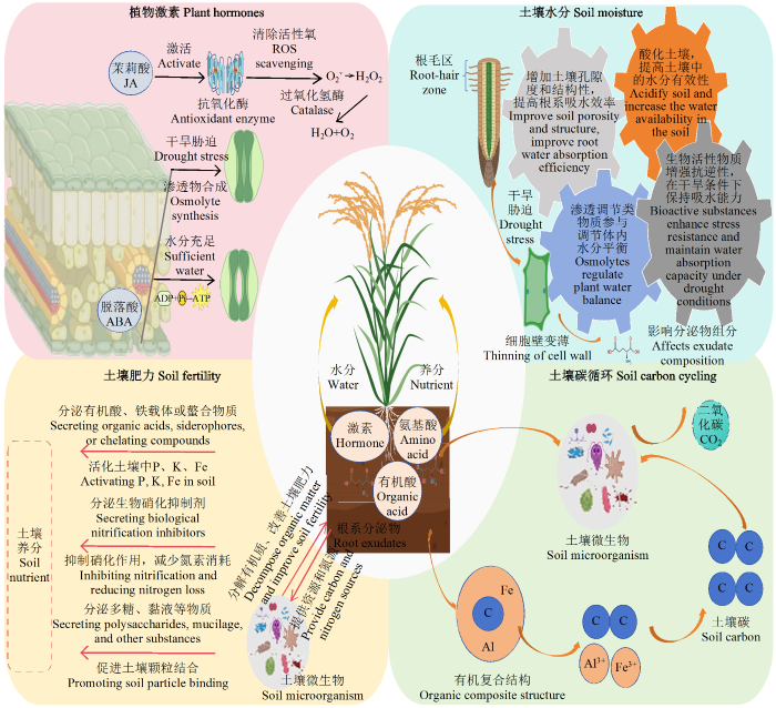 根系分泌物作为植物与土壤环境之间的沟通媒介,对土壤微生物群落的组成和功能具有重要影响。在干旱胁迫下,水稻根系通过调节分泌物的组成,为其提供了重要的碳源和氮源,促进土壤微生物的繁殖与代谢活动。同时根际微生物的代谢物质可以反过来影响植物根系信号的产生,进而影响根分泌物的种类和数量,促进水稻根系富集更多的促生菌[57]。这些微生物不仅在有机物分解过程中释放养分,还促进了土壤矿质养分的转化。此外,水稻根系分泌物对微生物群落的影响不仅限于提供养分,还可以通过调节微生物的生理活性,改变微生物群落的结构。干旱胁迫下,植物根系会增加有机酸和黄酮类化合物等分泌物的释放,促进固氮菌和分解菌等有益微生物的生长,同时抑制病原微生物的繁殖,从而改善土壤生态环境,增强植物的抗病能力[58]。有机酸还能调节土壤pH,增加土壤酸性,有利于某些微生物的生长。水稻根系分泌物形成的黏液层或生物膜还能减少根际水分的蒸发,提高土壤保水能力,为微生物的生存提供相对湿润的条件。同时,在干旱胁迫下,一些微生物通过根系分泌物与植物形成了共生关系,它们通过产生植物激素、调节植物水分代谢和养分吸收等方式,帮助土壤微生物维持其代谢活性,从而在一定程度上缓解干旱对植物的影响,提升植物的水分吸收和抗逆能力[59]。水稻根系分泌物中的某些物质如磷酸酶和螯合物质等,能够促进P和K等难溶性养分的溶解和释放,提高土壤中营养物质的有效性。