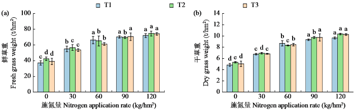由图1可知,T1、T2和T3处理下的油菜平均鲜草重分别为60.1、61.7和59.7 t/hm2,平均干草重分别为7.8、8.1和8.0 t/hm2,3种种植模式下油菜生物量整体上没有明显差异,T2处理较T1和T3处理鲜草重分别增加2.7%和3.4%,干草重增加3.8%和1.3%。随着施氮量的增加,不同种植模式下油菜生物量均呈上升趋势,与不施氮处理相比,施氮量为30 kg/hm2时3个处理鲜草重和干草重整体分别增加39.8%和35.1%;施氮量60 kg/hm2时分别增加63.0%和67.9%;施氮量90 kg/hm2时分别增加78.1%和89.0%;施氮量120 kg/hm2时分别增加86.5%和98.1%,3种模式下鲜草重和干草重均在施氮量为120 kg/hm2时达到最大。施氮量为90 kg/hm2时,T1和T3处理鲜草重和干草重与施氮量为120 kg/hm2时无显著差异;T2处理下在施氮量120 kg/hm2时鲜草重较90 kg/hm2时显著高出7.4%,干草重显著高出5.5%。