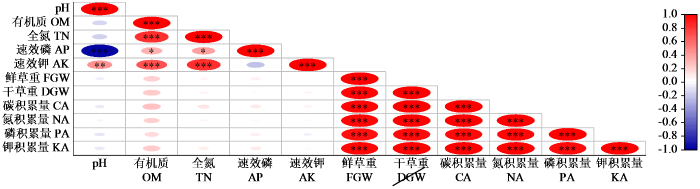 “***”,“**”, and“*”indicate significant difference among treatments at P < 0.001, P < 0.01, and P < 0.05 levels, respectively. OM: organic matter, TN: total N, AP: available P, AK: available K, FGW: fresh grass weight, DGW: dry grass weight, CA: carbon accumulation, NA: nitrogen accumulation, PA: phosphorus accumulation, KA: potassium accumulation.