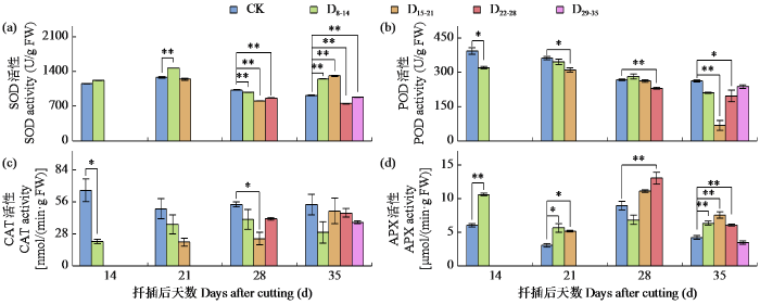 与CK处理相比,D8-14和D15-21处理下甘薯根系SOD活性无显著降低,复水8~14 d后其活性有极显著增加,甚至高于CK处理;D22-28和D29-35处理使甘薯根系SOD活性极显著下降(图4a)。