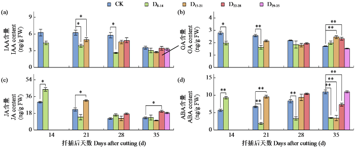由图5可知,与CK相比,D8-14和D15-21处理的甘薯根系ABA和JA含量显著或极显著增加,其中ABA和JA增加幅度均在40%以上;而IAA含量显著降低,且降低幅度均小于ABA和JA的增加幅度。在块根分化建成后期进行干旱处理(D22-28)时,甘薯根系的这4种内源激素含量变化均未达到显著水平。说明甘薯在块根分化建成前期和中期受到干旱胁迫时,通过升高根系JA和ABA的含量来应对胁迫,且响应比较强烈,但在块根膨大期遭遇干旱胁迫时,仅JA能够产生强烈的响应,有显著的增加。