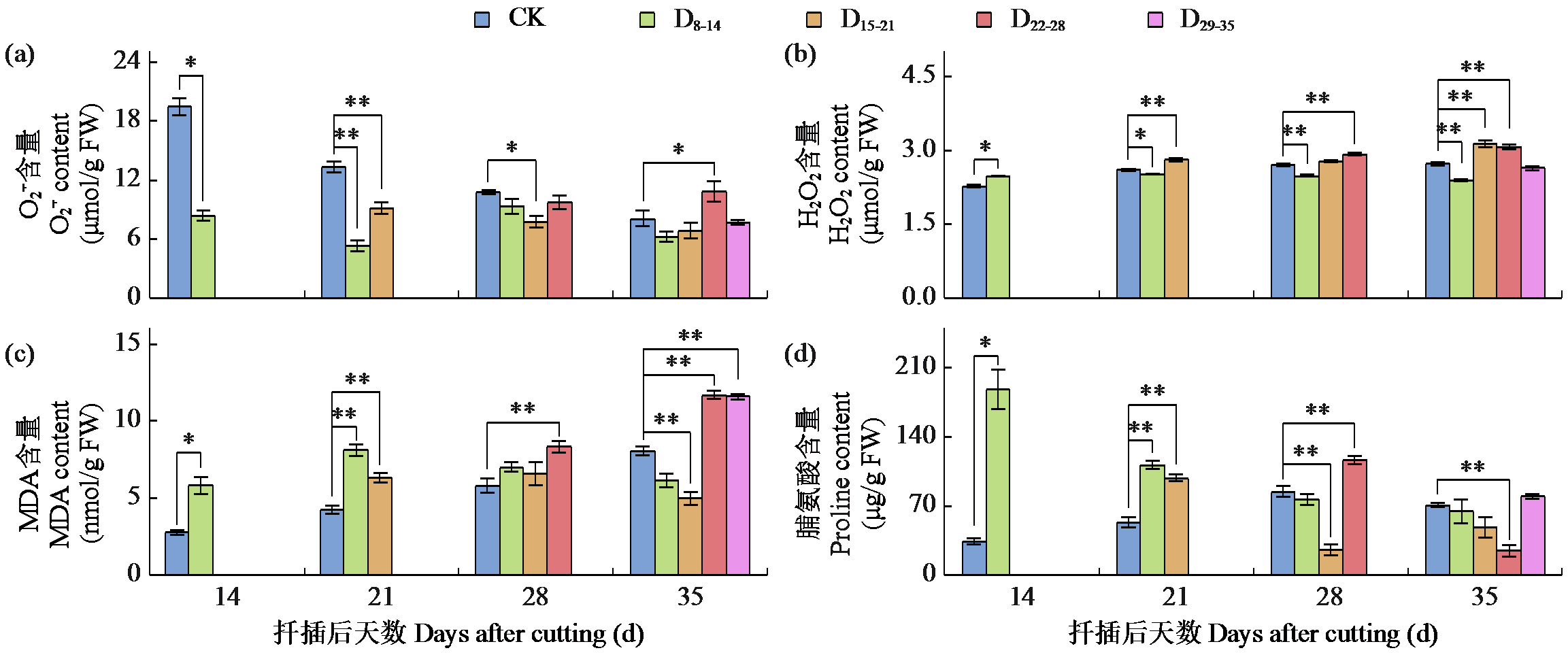 | 图3 不同时期干旱―复水对甘薯根系O2-. 、H2O2、MDA和脯氨酸含量的影响 “*”和“**”分别表示在P < 0.05和P < 0.01水平上差异显著或极显著,下同。 |
