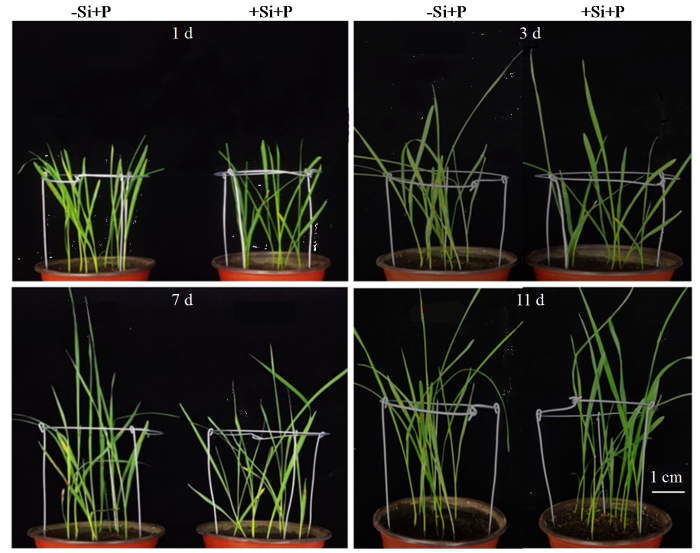 设置4个处理,分别为CK(不施硅,不接种秆锈菌)、+Si-P(施硅,不接种秆锈菌)、-Si+P(不施硅,接种秆锈菌)和+Si+P(施硅,接种秆锈菌),每个处理重复3次。从燕麦出苗开始每隔3 d使用含1.5 mmol/L K2SiO3的Hoagland营养液(前期研究[30]结果已证明该浓度抗病效果最佳)进行浇灌,不施硅处理加入含3.0 mmol/L KCl的营养液,以补充由于施硅量不同带来的钾含量差异,每盆浇灌200 mL。
