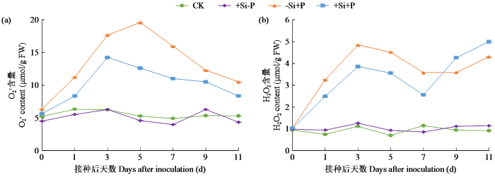 O2-. 和H2O2可通过启动膜脂过氧化或膜脂脱酯作用对植物造成损伤。如图3所示,在不接种秆锈病菌的条件下,无论是否施硅,燕麦叶片的O2-. 和H2O2含量均无明显变化,且施硅与不施硅处理间的差异不明显。接种秆锈病菌后,叶片O2-. 含量在侵染初期迅速上升,于接种后5 d达峰值后随即下降(图3a);施硅处理下,叶片O2-. 含量于接种后3 d达峰值,且在接种后1~7 d内较不施硅处理降低19.45%~35.66%。接种秆锈病菌后,不施硅和施硅处理下燕麦叶片H2O2含量均在侵染初期迅速升高,分别于接种后3 d和11 d达峰值(图3b);在接种后1~7 d内,与不施硅处理相比,施硅处理下H2O2含量降低了20.41%~28.49%。综上,施硅可有效降低秆锈病菌侵染下燕麦叶片的ROS含量,进而提高其抗病性。