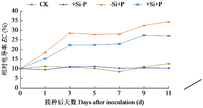 不同处理对燕麦叶片质膜透性的影响如图5所示,在不接种秆锈病菌的情况下,施硅与不施硅处理的叶片EC均无明显变化。接种秆锈病菌后,施硅与不施硅处理的EC变化规律基本一致,侵染初期,叶片EC逐渐上升,接种后3~7 d进入平稳阶段,随后再次持续升高。在接种后1~11 d内,施硅处理下的EC较不施硅处理降低3.27~7.38个百分点。