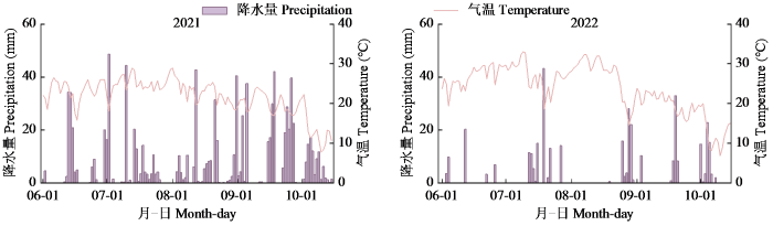 试验于陕西杨陵玉米试验基地(108°08′ N,34°31′ E)进行,海拔约500 m,地处关中平原中部,属大陆性季风气候。年均温12.9 ℃,无霜期211 d,年日照时数2163.8 h,年均降水量635.1 mm。采用双季种植模式,前茬作物为油菜。土壤为娄土,2021年0~20 cm土壤有机质含量7.58 g/kg、全氮0.94 g/kg、速效氮53.46 mg/kg、速效磷22.52 mg/kg、速效钾138.69 mg/kg;2022年相应数据为7.15 g/kg、0.87 g/kg、49.35 mg/kg、24.14 mg/kg、440.16 mg/kg。试验期间温度和降水量数据见图1。