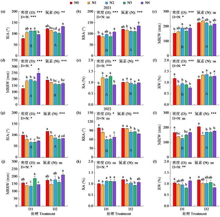 密度和氮肥均显著影响玉米的根系构型,且二者有显著交互作用(图3)。当种植密度增加时,玉米根系行间张角、株间张角、行间最大宽度以及行间与株间最大宽度比均显著提高,提高幅度分别为8.9%~56.2%(除2021年N2和N3处理分别降低4.2%和9.0%)、15.1%~42.4%(除2022年N1处理降低1.2%)、5.9%~46.3%、3.3%~68.7%(除2021年N0处理降低3.1%、2022年N4处理降低26.6%)。2021年,随着种植密度增加,根系株间最大宽度、行间与株间最大张角比显著降低,降低幅度分别为7.1%~32.1%(除N0处理升高33.9%)和16.5%~27.8%(除N0和N4处理分别升高19.5%和9.6%)。2021年,在D1密度下,施氮处理显著提高根系行间张角、行间和株间最大宽度以及行间与株间最大张角比;2022年,除根系株间最大宽度以及行间与株间最大张角比在部分施氮处理下有所提高外,各根系构型指标在施氮处理下均降低,密度与氮肥对玉米根系株间最大宽度、行间与株间最大张角比和宽度比的影响不显著;比较2年之间的差异可得,除N0处理外,2021年根系行间张角、株间张角和行间最大宽度较2022年分别提高了4.5%~39.6%、2.3%~41.0%和8.0%~32.5%,这可能是2022年高温干旱天气导致降水量减少,生长季节最高温度升高,多达18 d温度超过30 ℃(图1)。增加种植密度促进玉米根系在行间延伸,更多地利用行间土壤空间,而施氮对玉米根系构型作用较小。