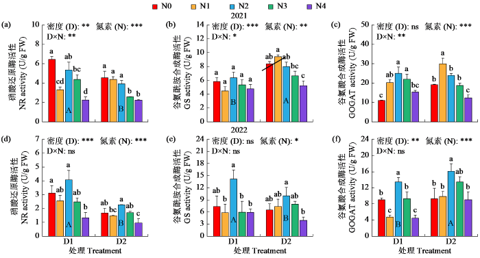 2021-2022年不同密度和氮肥处理对玉米根系氮代谢酶活性的影响