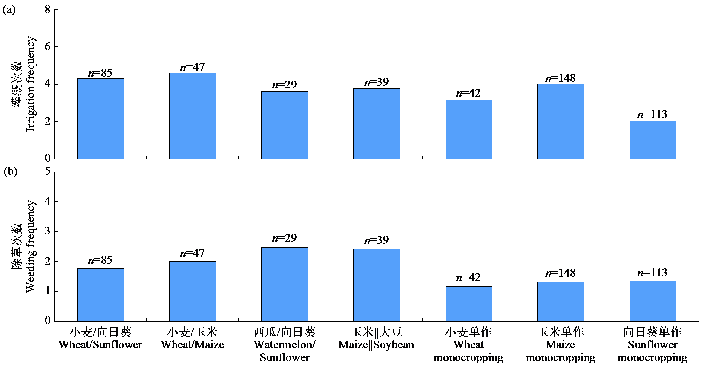 | Fig.4 Irrigation frequency and weeding frequency of different cropping systems “n”represents the number of survey samples. |