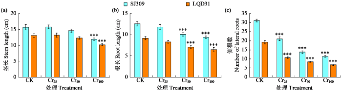 经铬胁迫处理3周后,在真空室中,用甲醛―乙醇―乙酸(formaldehyde-alcohol-acetic acid,FAA)固定叶片30 min,在初固定的15 min内需抽放真空数次。用碘化丙啶(10 μg/mL,磷酸盐缓冲液)对洗净的叶片染色15 min,随后放入甘油中。利用TCS SP8激光扫描共聚焦显微系统(徕卡,德国)在DMI600倒置显微镜(徕卡,德国)上运行,配备63×NA1.3甘油浸没式透镜用于成像,在采集透射光图像的同时使用488 nm激发波长采集荧光图像。利用ImageJ软件测定水稻茎长、根长和侧根数。定量分析时进行50次重复试验。