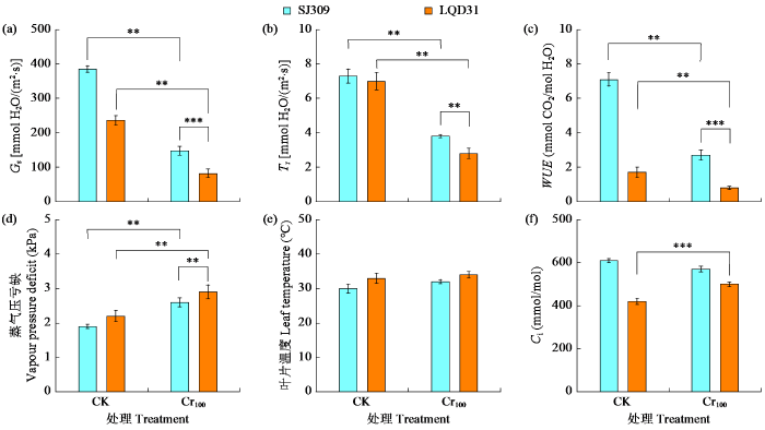 使用CIRAS-3便携式光合作用测定系统(PP Systems,美国)分析CK和Cr100处理下2个水稻品种叶片的气孔导度(Gs)、蒸腾速率(Tr)、水分利用率(WUE)、胞间CO2浓度(Ci)、蒸气压亏缺和叶片温度。