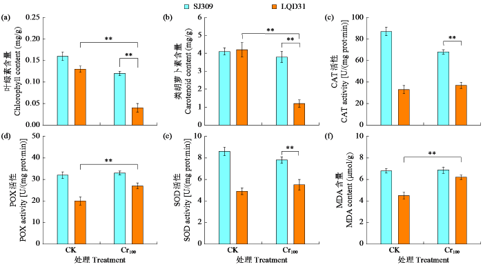 水稻的光合色素含量受铬胁迫的影响(图5a~b),Cr100处理下SJ309和LQD31叶片中叶绿素含量分别减少了22.0%和65.8%,类胡萝卜素含量分别减少了8.1%和65.2%,表明LQD31叶片受铬胁迫的影响更为显著。Cr100处理下,SJ309的CAT活性降低了21.0%,LQD31则提高了16.3%(图5c);SJ309和LQD31的POD活性分别提高了3.0%和34.9%(图5d);SJ309的SOD活性降低了9.1%,LQD31则提高了7.0%(图5e);SJ309和LQD31的MDA含量分别提高了1.0%和34.2%,LQD31材料Cr100与CK处理相比有显著差异(图5f)。