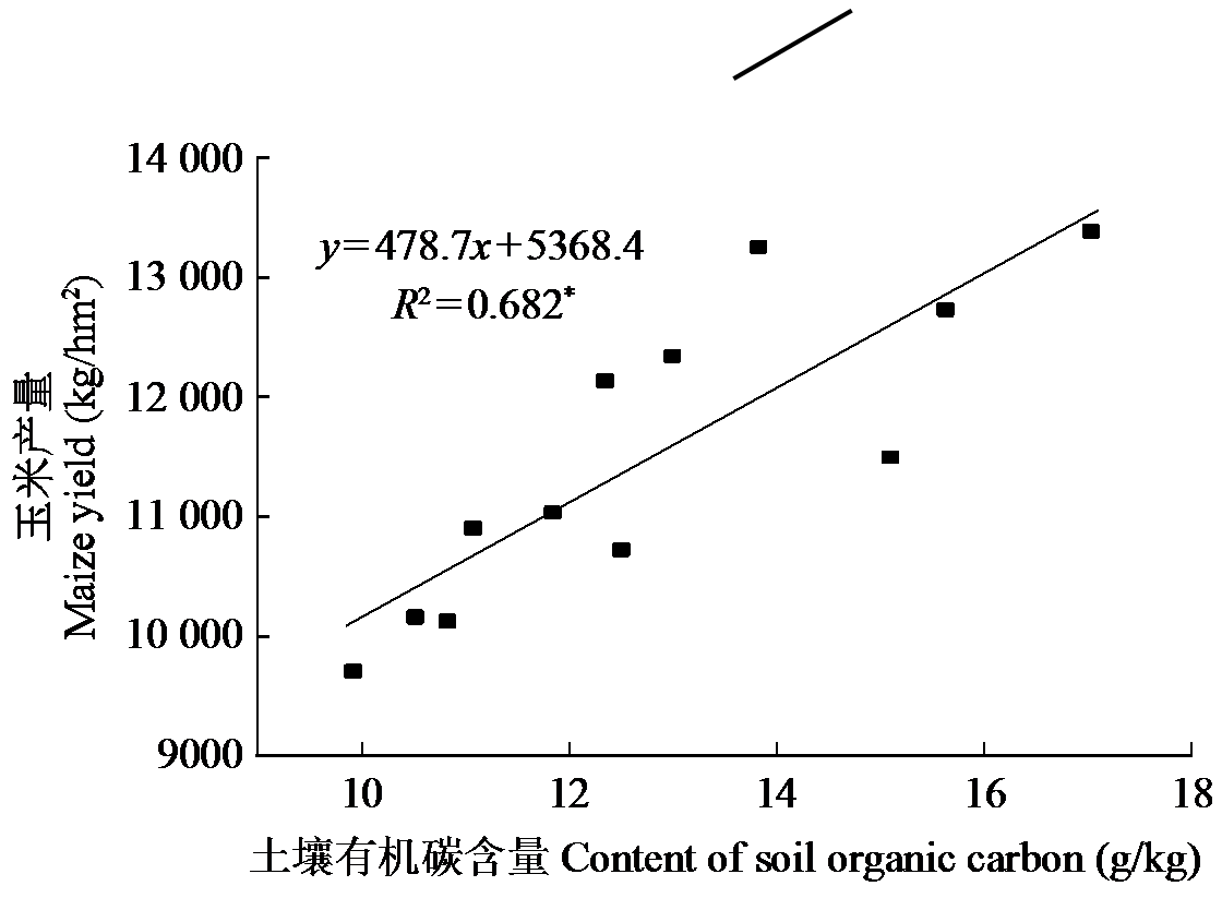 | 图4 土壤有机碳含量与玉米产量相关性 “*”表示在P < 0.05水平显著相关。 |