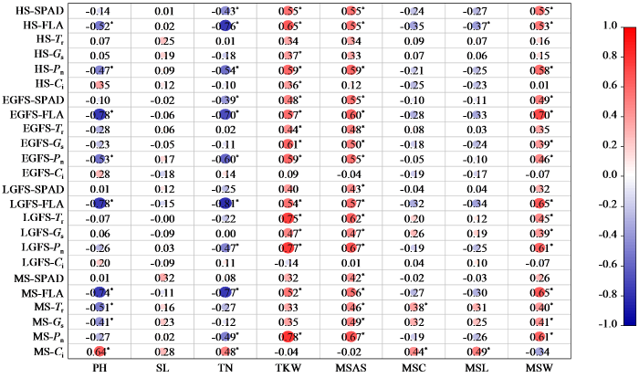 HS:抽穗期;EGFS:灌浆前期;LGFS:灌浆后期;MS:成熟期;PH:株高;PL:穗长;TTN:分蘖总数;TKW:千粒重;MSAS:平均种子表面积;MSC:平均种子周长;MSL:平均种子长;MSW:平均种子宽。“*”表示在P < 0.05水平显著相关。