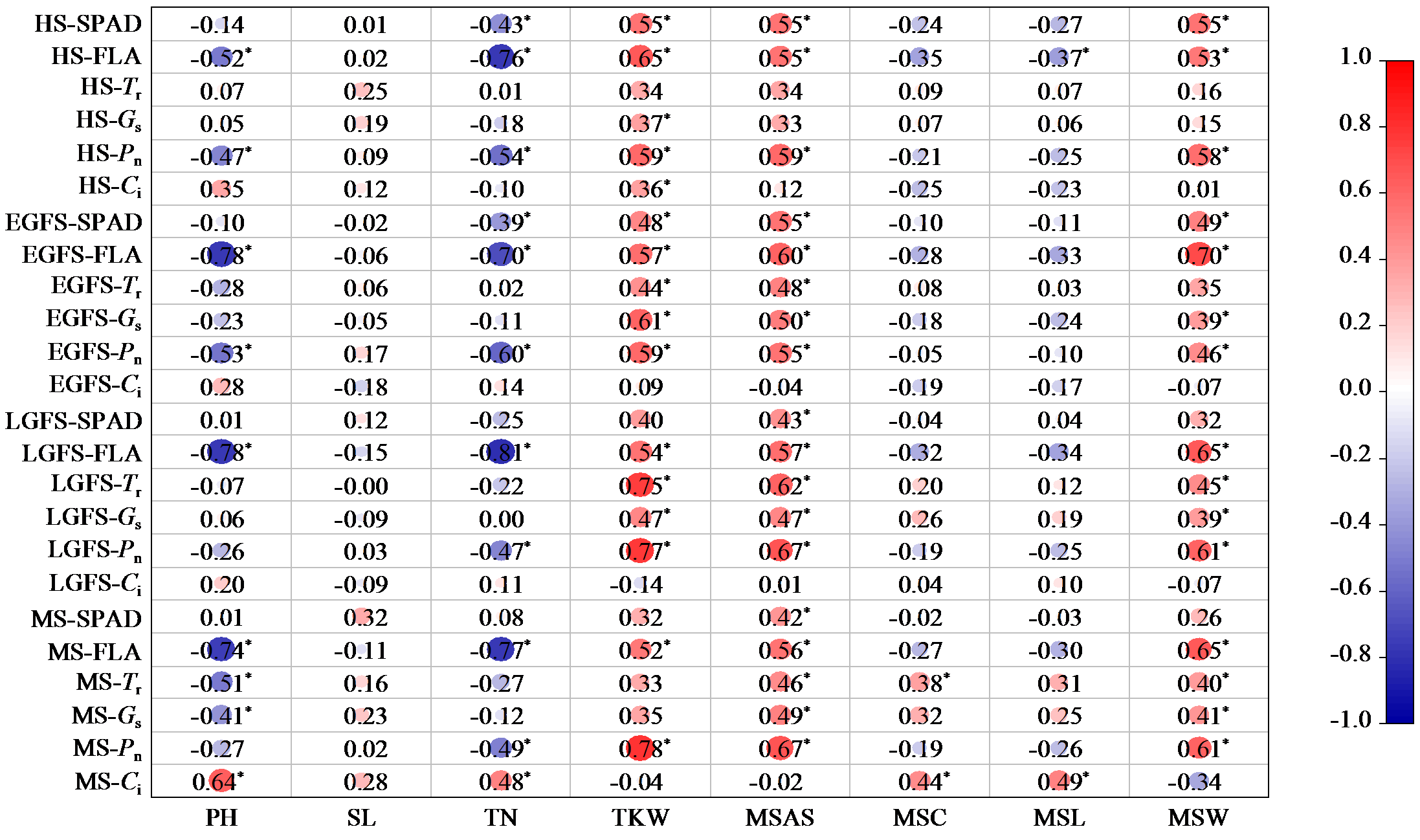 | Fig.1 Correlation analysis between photosynthetic characteristics and agronomic traits of oat HS: heading stage; EGFS: early grain-filling stage; LGFS: late grain-filling stage; MS: maturity stage; PH: plant height; PL: panicle length; TTN: total tiller number; TKW: 1000-grain weight; MSAS: mean surface area of seed; MSC: mean seed circumference; MSL: mean seed length; MSW: mean seed width.“*”indicates significant correlations at P < 0.05 level. |