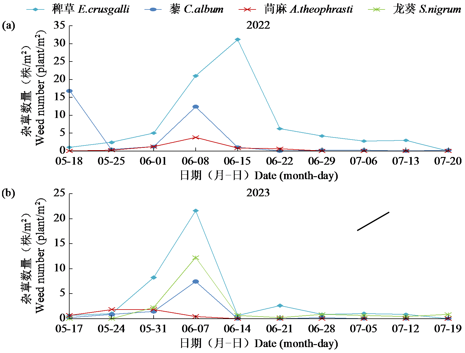 | 图3 麦―豆轮作模式下大豆田优势种杂草发生动态 |