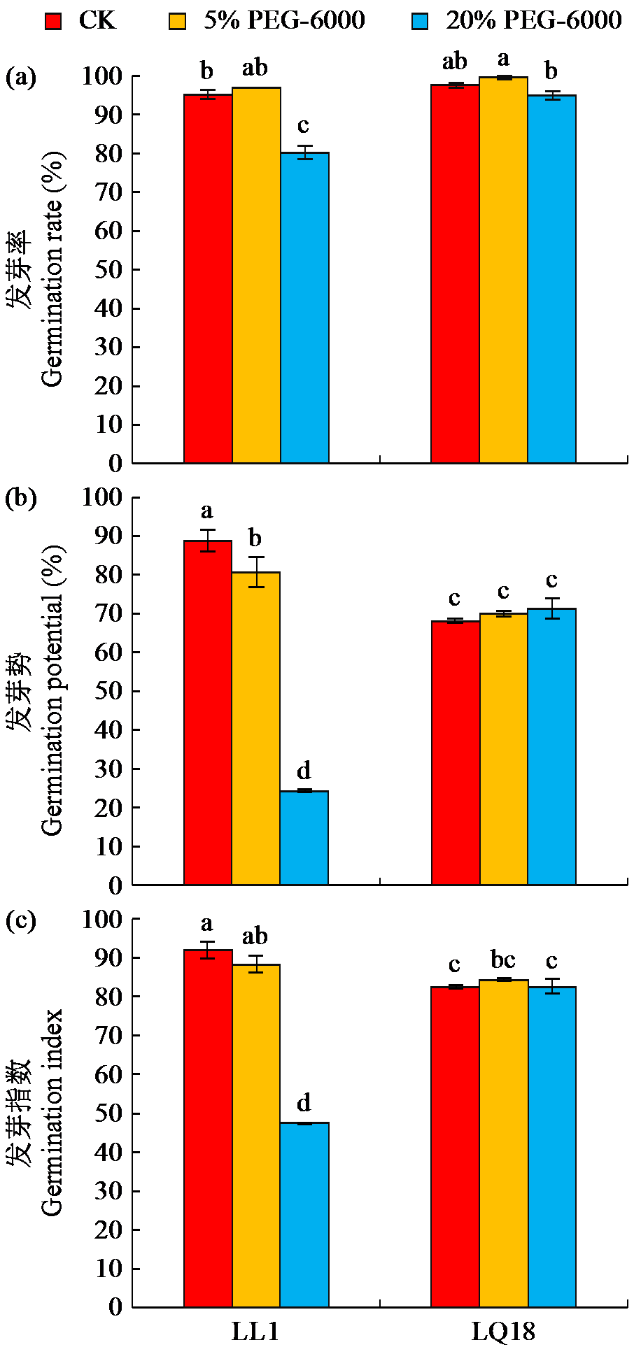 | 图1 干旱胁迫对2个品种(系)藜麦发芽率、发芽势和发芽指数的影响 不同小写字母表示在P < 0.05水平差异显著,下同。 |