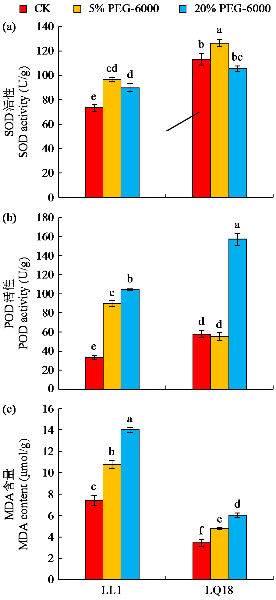| 图3 干旱胁迫对2个品种(系)藜麦幼苗SOD、POD活性及MDA含量的影响 |