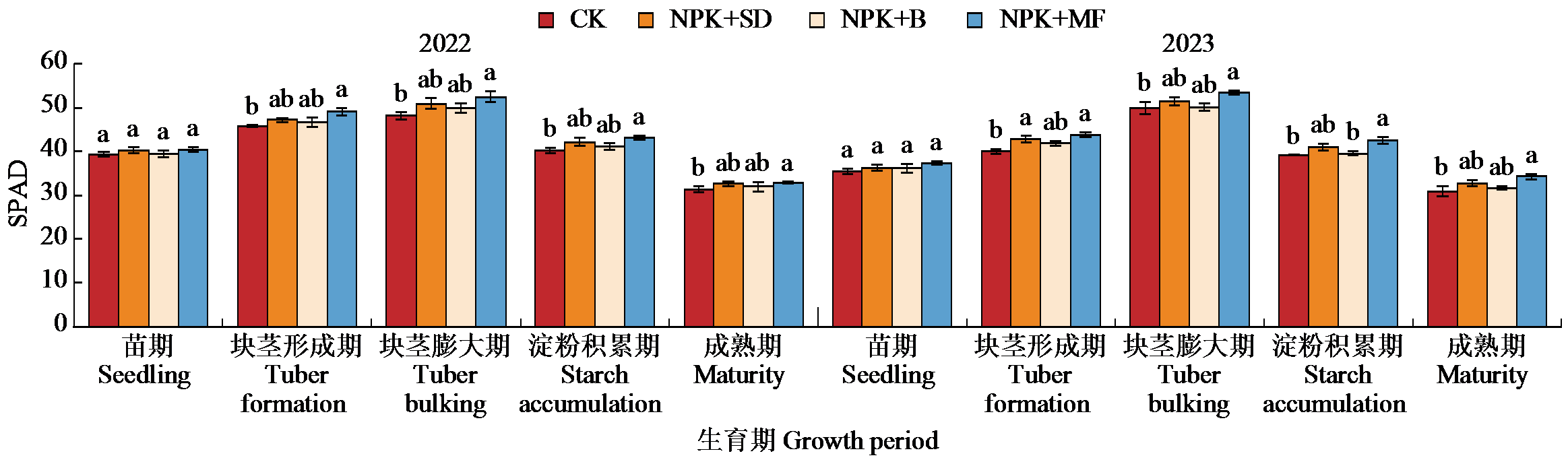 | Fig.3 Change in SPAD values of potato under different fertilization treatments at various growth stages from 2022 to 2023 |