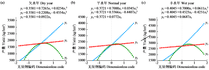 | 平水年Normal year | Y平水年=0.3721+0.7088X1+0.3366X2+0.0772X3+0.0345X12-0.4407X22+0.2937X1X2+0.0387X1X3+0.0192X2X3 | 0.849 | 88.41 | <0.001 |