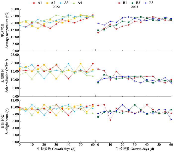 2022和2023年不同移栽期条件下平均气温、太阳总辐射和日照时数如图1 所示。不同移栽期下同一生长时期的气温、太阳辐射和日照时数存在较明显的差异。从整个时期来看,随移栽期推迟,平均气温呈现升高趋势,太阳辐射和日照时数呈现略降趋势。