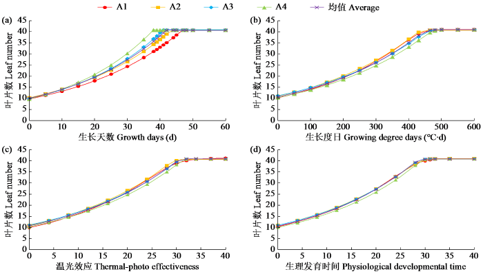 作物生长发育模拟模型主要对生育期内的生理生态过程及其与生态条件的关系进行动态模拟与预测[7 ] ,是现代农业生产信息化和数字化的基础[8 ] ,在诸多农业领域得到应用,成为农业生产定量评价的重要手段[9 ] ,其中,叶片数目动态模拟是作物生长模型的重要组成部分。温度和光照是影响作物生长发育进程的主要环境因素,关于作物叶片数目动态及叶龄发育的模拟前人已开展较多研究,分别以有效积温、热时间、辐热积和生理发育时间等为变量,在水稻[4 ] 、玉米[10 ] 、棉花[11 ] 和番茄[3 ] 等多种作物上建立叶龄发育模拟模型,为烟草叶片数目发育模型的研究提供有益借鉴。